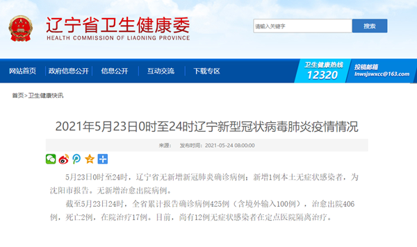 中国网5月24日讯 据辽宁省卫生健康委员会官方网站消息,5月23日0时至24时,辽宁省无新增新冠肺炎确诊病例;新增1例本土无症状感染者,为沈阳市报告。无新增治愈出院病例。