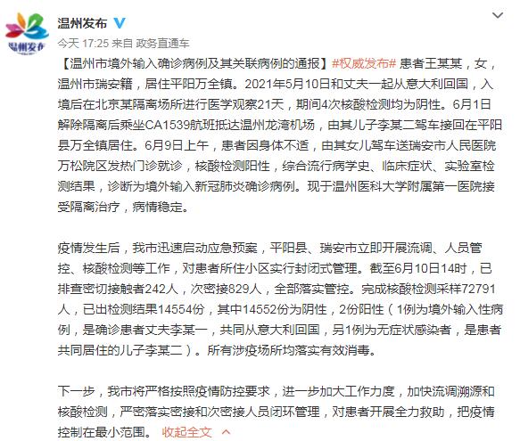 通报称,患者王某某,女,温州市瑞安籍,居住平阳万全镇。2021年5月10日和丈夫一起从意大利回国,入境后在北京某隔离场所进行医学观察21天,期间4次核酸检测均为阴性。6月1日解除隔离后乘坐CA1539航班抵达温州龙湾机场,由其儿子李某二驾车接回在平阳县万全镇居住。6月9日上午,患者因身体不适,由其女儿驾车送瑞安市人民医院万松院区发热门诊就诊,核酸检测阳性,综合流行病学史、临床症状、实验室检测结果,诊断为境外输入新冠肺炎确诊病例。现于温州医科大学附属第一医院接受隔离治疗,病情稳定。