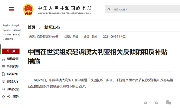 中国网6月24日讯 据商务部网站消息,6月24日,中国就澳大利亚对自中国进口铁道轮毂、风塔、不锈钢水槽产品采取的反倾销和反补贴措施在世贸组织争端解决机制项下提出起诉。