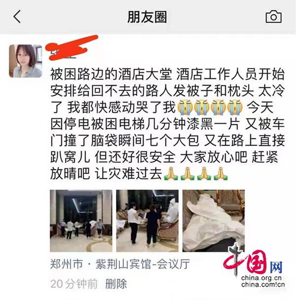 郑州紫荆山宾馆全员出动,为救援队伍清洗、晾晒衣物,搬运行李,装卸物资,提供各类生活物资,全力做好各项保障。