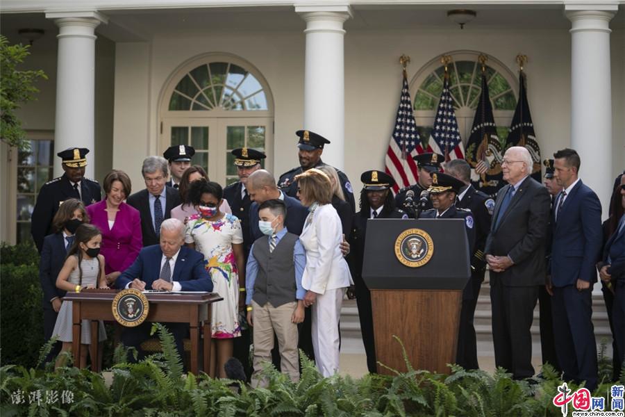 当地时间2021年8月5日,美国华盛顿,美国总统拜登签署了一项法案,将授予在1月6日的美国国会骚乱中保卫国会大厦的执法人员四枚国会奖章。(澎湃影像)