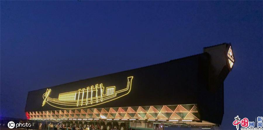 当地时间2021年8月9日公布的图片,一艘陪葬古埃及法老胡夫的太阳船已由胡夫金字塔附近搬迁至大埃及博物馆。(IC photo)