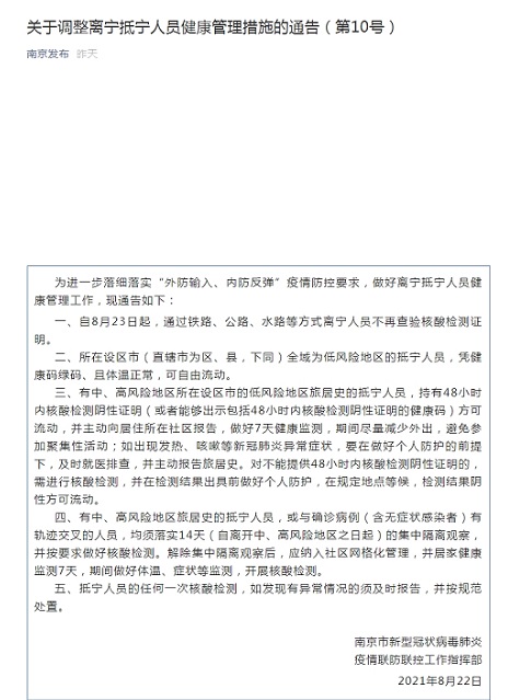中国网8月23日讯 据南京市委宣传部微信公众号消息,南京市新型冠状病毒肺炎疫情联防联控工作指挥部22日发布通告称,自8月23日起,通过铁路、公路、水路等方式离宁人员不再查验核酸检测证明。