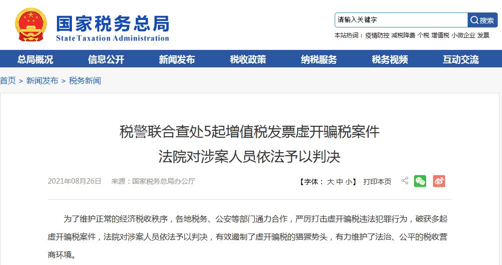 中国网8月26日讯 据国家税务总局网站消息,为了维护正常的经济税收秩序,各地税务、公安等部门通力合作,严厉打击虚开骗税违法犯罪行为,破获多起虚开骗税案件,法院对涉案人员依法予以判决,有效遏制了虚开骗税的猖獗势头,有力维护了法治、公平的税收营商环境。