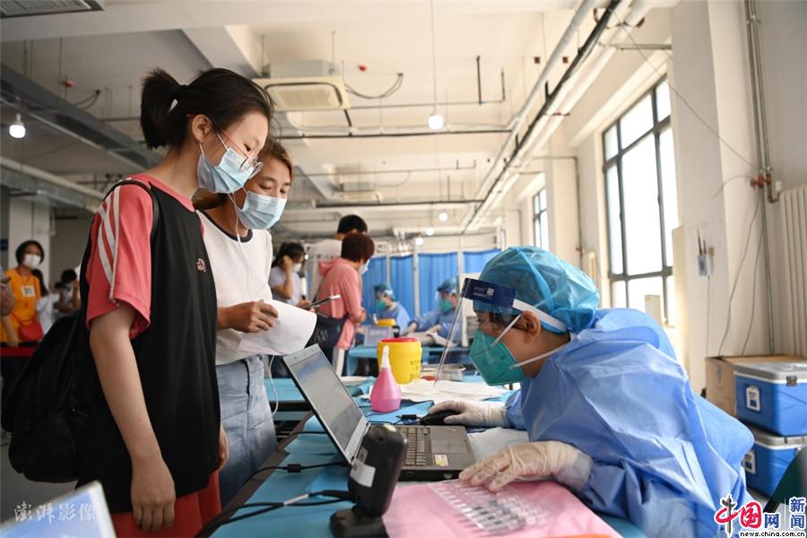 2021年8月26日,北京市丰台区,12至17岁的青少年在家长的陪同下进入疫苗接种点进行登记。陶冉/澎湃影像