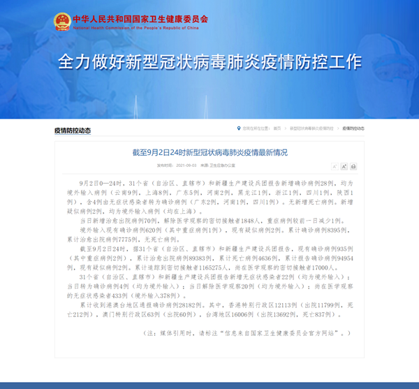 截至9月2日24时,据31个省(自治区、直辖市)和新疆生产建设兵团报告,现有确诊病例935例(其中重症病例2例),累计治愈出院病例89383例,累计死亡病例4636例,累计报告确诊病例94954例,现有疑似病例2例。累计追踪到密切接触者1165275人,尚在医学观察的密切接触者17000人。