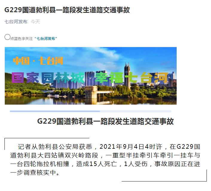 中国网9月4日讯 据中共七台河市委宣传部微信公众号“七台河发布”消息,黑龙江省七台河市勃利县公安局称,2021年9月4日4时许,在G229国道勃利县大四站镇双兴岭路段,一重型半挂牵引车牵引一挂车与一台四轮拖拉机相撞,造成15人死亡,1人受伤,事故原因正在进一步调查核实中。
