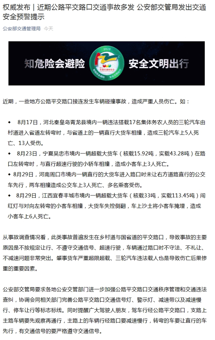 中国网9月6日讯 据公安部交通管理局微信公众号消息,近期,一些地方公路平交路口接连发生车辆碰撞事故,造成严重人员伤亡,公安部交通管理局发出交通安全预警提示。