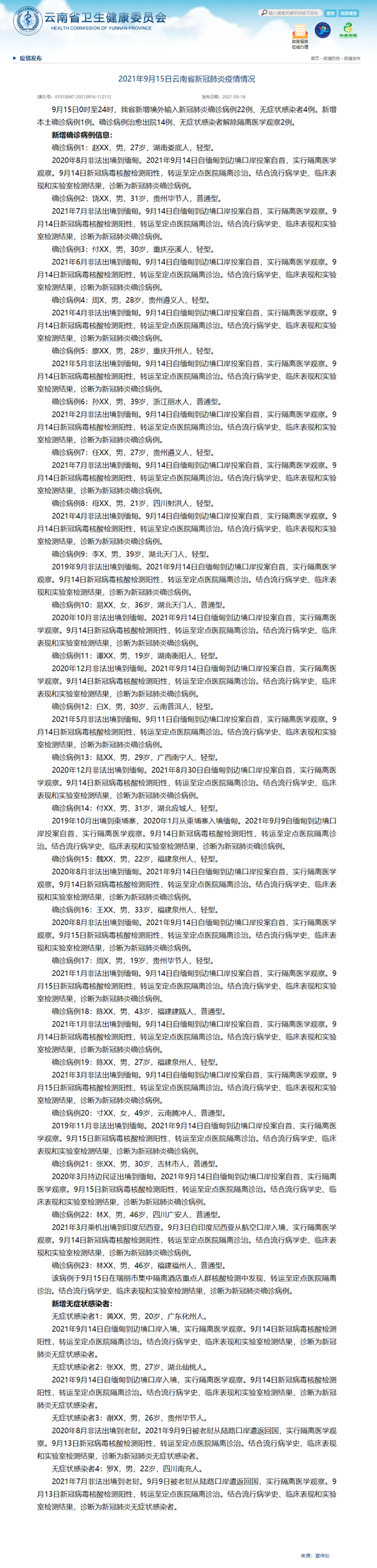 中国网9月16日讯 据云南省卫健委网站消息,9月15日0时至24时,云南省新增新冠肺炎境外输入确诊病例22例、无症状感染者4例。新增本土确诊病例1例。确诊病例治愈出院14例,无症状感染者解除隔离医学观察2例。