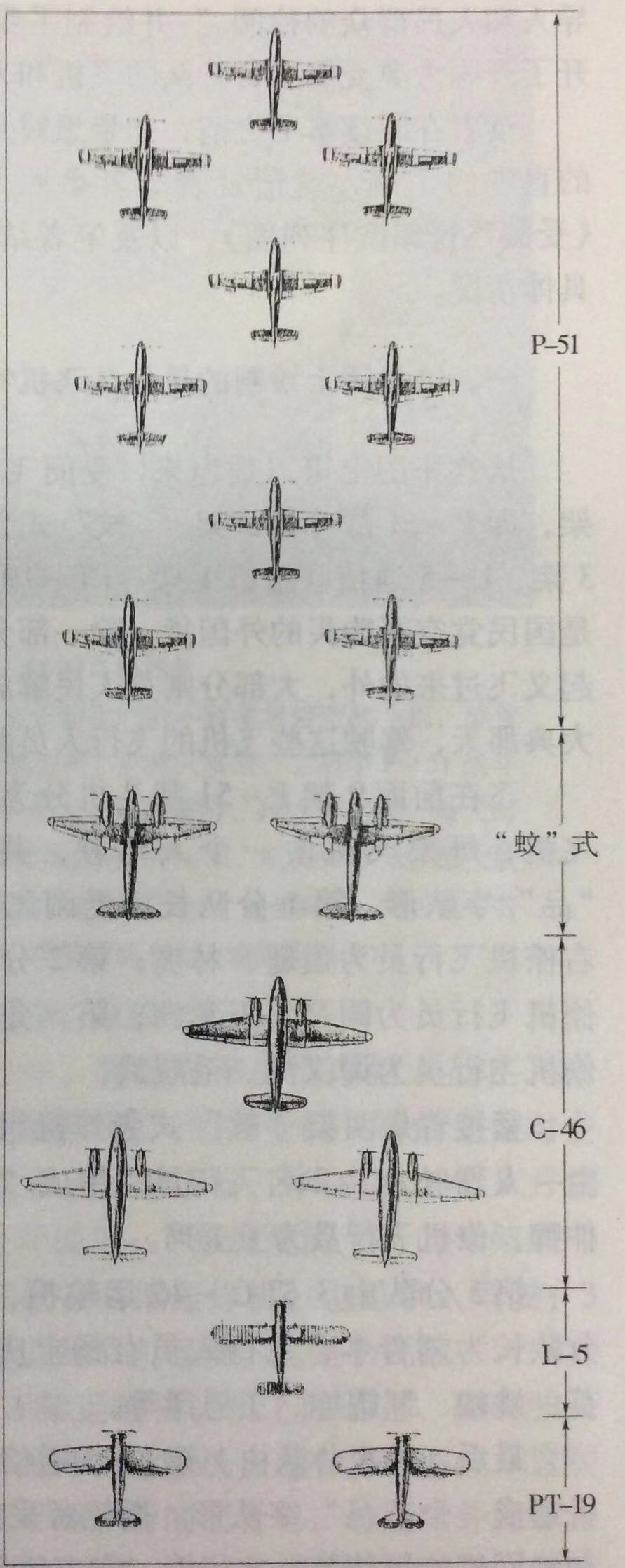 空中受阅机队由6个分队组成。9架P-51战斗机为第一至第三分队;2架蚊式战斗轰炸机为第四分队;3架C-46运输机为第五分队;1架通讯机、2架教练机为第六分队,共计17架飞机。