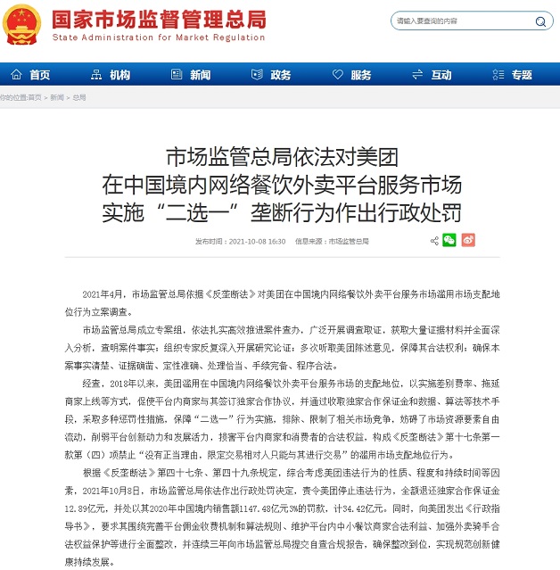 中国网10月8日讯 据国家市场监督管理总局网站消息,2021年4月,市场监管总局依据《反垄断法》对美团在中国境内网络餐饮外卖平台服务市场滥用市场支配地位行为立案调查。