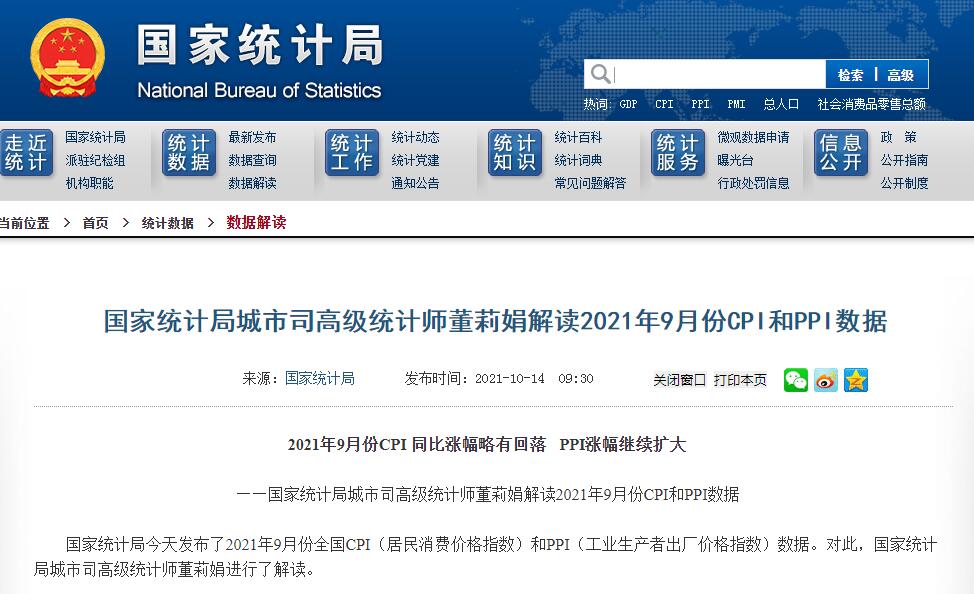 中国网10月14日讯 据国家统计局网站消息,国家统计局今天发布了2021年9月份全国CPI(居民消费价格指数)和PPI(工业生产者出厂价格指数)数据。对此,国家统计局城市司高级统计师董莉娟进行了解读。