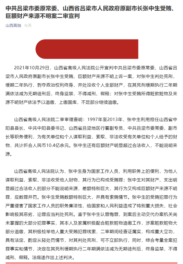 中国网10月29日讯 据山西省高级人民法院官方微信“山西高院”消息,2021年10月29日,山西省高级人民法院公开宣判中共吕梁市委原常委、山西省吕梁市人民政府原副市长张中生受贿、巨额财产来源不明上诉一案,对张中生判处死刑,缓期二年执行,剥夺政治权利终身,并处没收个人全部财产,在其死刑缓期执行二年期满依法减为无期徒刑后,终身监禁,不得减刑、假释;对张中生受贿所得赃款赃物及来源不明财产依法予以追缴,上缴国库,不足部分继续追缴。