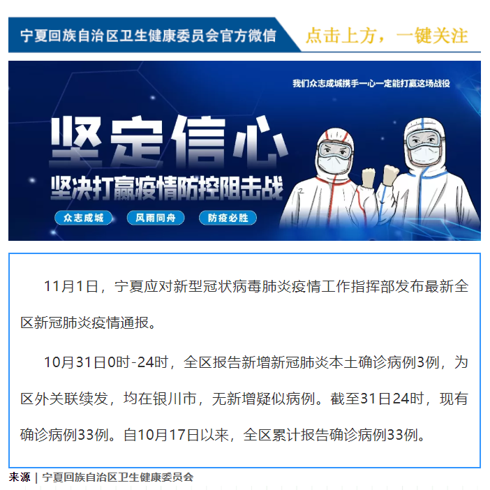 中国网11月1日讯 据宁夏回族自治区卫生健康委员会官方微信公众号消息,11月1日,宁夏应对新型冠状病毒肺炎疫情工作指挥部发布最新全区新冠肺炎疫情通报。