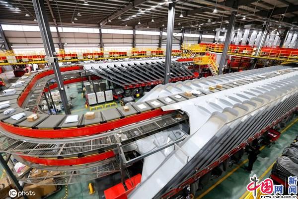 资料图:2021年11月7日,在位于山东省青岛市即墨国际陆港的青岛顺丰华骏分拨中心,全自动智能分拣系统快速的分拣包裹。IC photo