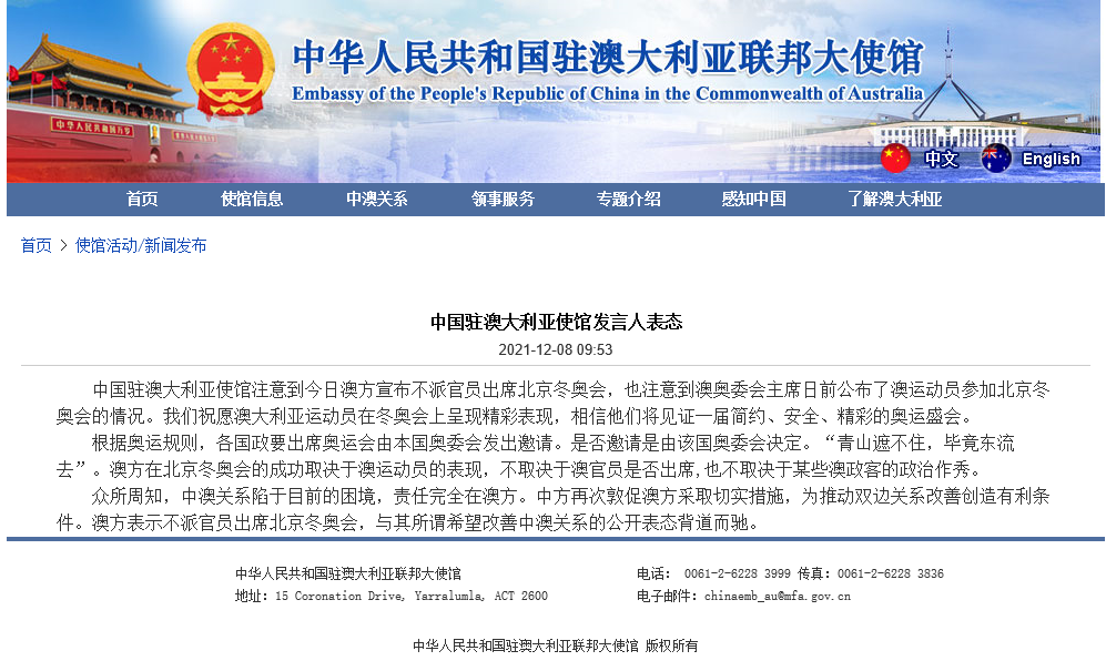 中国网12月8日讯 针对澳大利亚方面宣布不派官员出席北京冬奥会一事,中国驻澳大利亚使馆发言人表示,中国驻澳使馆注意到今日澳方宣布不派官员出席北京冬奥会,也注意到澳奥委会主席日前公布了澳运动员参加北京冬奥会的情况。中方祝愿澳大利亚运动员在冬奥会上呈现精彩表现,相信他们将见证一届简约、安全、精彩的奥运盛会。