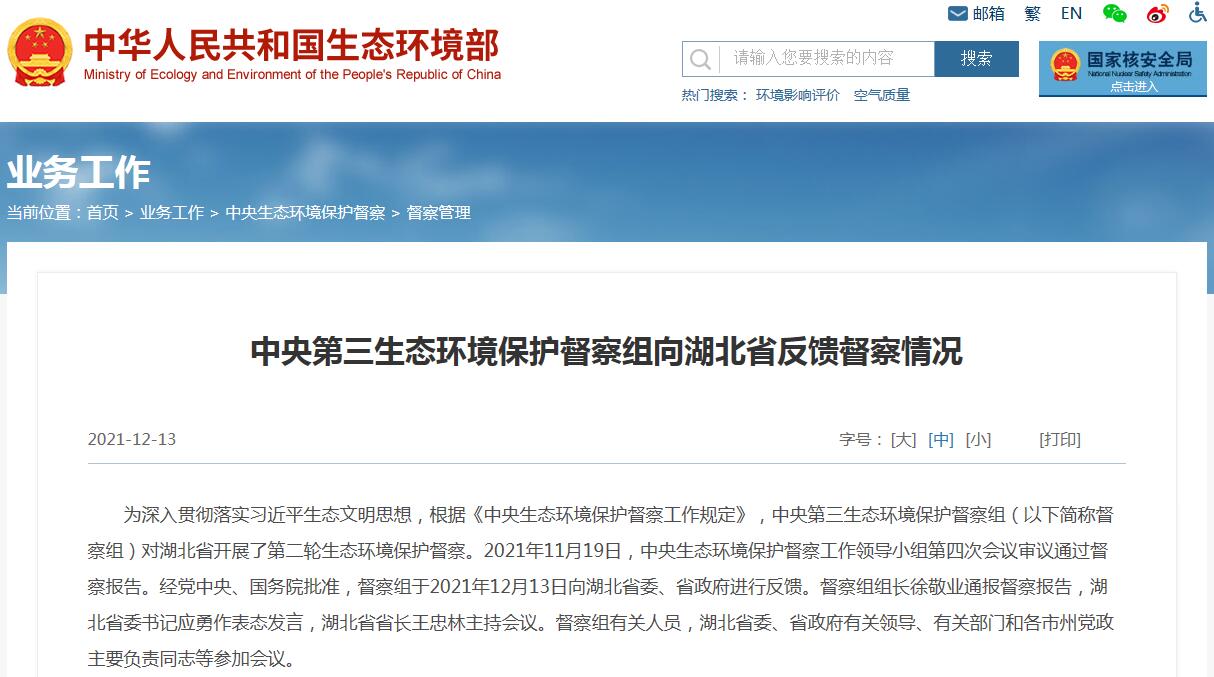 中国网12月13日讯 据生态环境部网站消息,为深入贯彻落实习近平生态文明思想,根据《中央生态环境保护督察工作规定》,中央第三生态环境保护督察组(以下简称督察组)对湖北省开展了第二轮生态环境保护督察。2021年11月19日,中央生态环境保护督察工作领导小组第四次会议审议通过督察报告。经党中央、国务院批准,督察组于2021年12月13日向湖北省委、省政府进行反馈。督察组组长徐敬业通报督察报告,湖北省委书记应勇作表态发言,湖北省省长王忠林主持会议。督察组有关人员,湖北省委、省政府有关领导、有关部门和各市州党政主要负责同志等参加会议。