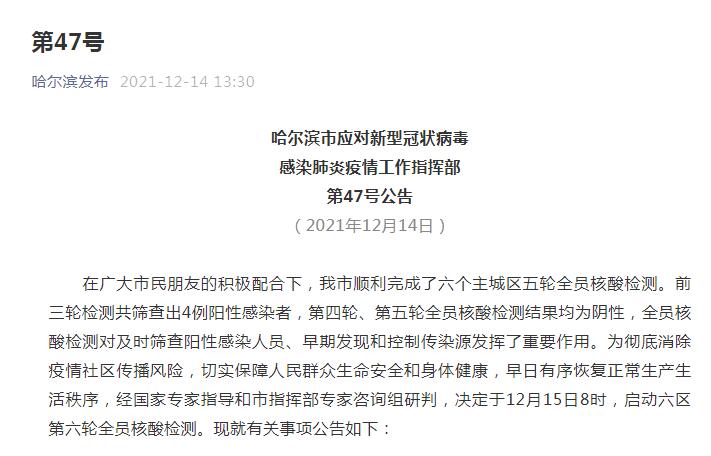 中国网12月14日讯 据哈尔滨市互联网信息办公室微信公众号消息,哈尔滨市应对新型冠状病毒感染肺炎疫情工作指挥部今日发布第47号公告。公告称,12月15日8时,哈尔滨市启动六区第六轮全员核酸检测。