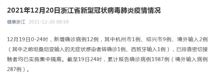 中国网12月20日讯 据浙江省卫生健康委员会微信公众号消息,12月19日0-24时,新增新冠肺炎确诊病例12例,其中杭州市1例、绍兴市9例、境外输入2例(其中之前坦桑尼亚输入的无症状感染者转确诊1例、西班牙输入1例),已排查密切接触者均已实施集中隔离。截至19日24时,累计报告确诊病例1987例(境外输入病例287例)。