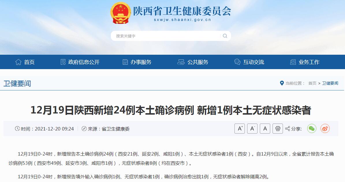 中国网12月20日讯 据陕西省卫生健康委员会网站消息,12月19日0-24时,新增报告本土确诊病例24例(西安21例、延安2例、咸阳1例)、本土无症状感染者1例(西安)。自12月9日以来,全省累计报告本土确诊病例53例(西安市49例、延安市3例、咸阳市1例),无症状感染者8例(均在西安市)。