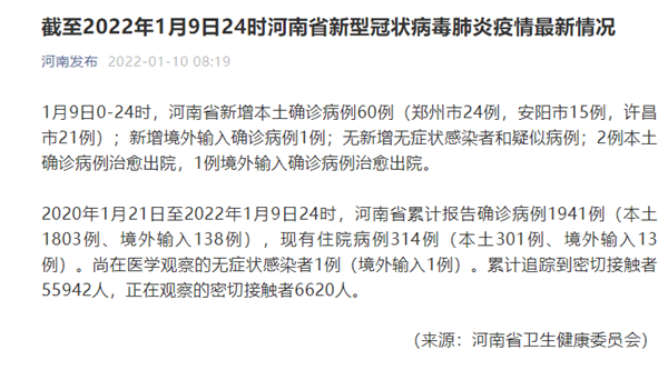 中国网1月10日讯 据河南省卫生健康委员会微信公众号“河南发布”消息,1月9日0-24时,河南省新增新冠肺炎本土确诊病例60例(郑州市24例,安阳市15例,许昌市21例);新增境外输入确诊病例1例;无新增无症状感染者和疑似病例;2例本土确诊病例治愈出院,1例境外输入确诊病例治愈出院。