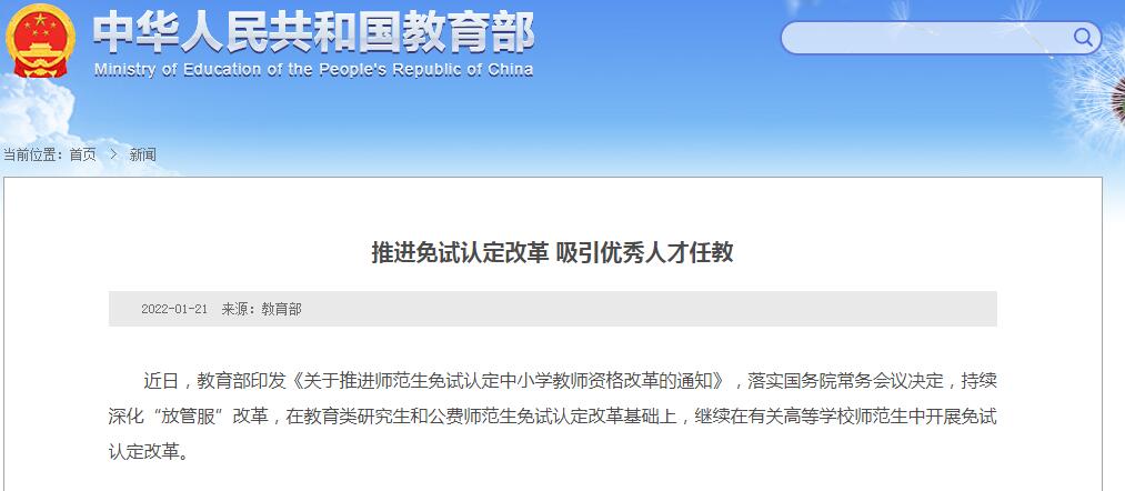中国网1月21日讯 据教育部网站消息,近日,教育部印发《关于推进师范生免试认定中小学教师资格改革的通知》,落实国务院常务会议决定,持续深化“放管服”改革,在教育类研究生和公费师范生免试认定改革基础上,继续在有关高等学校师范生中开展免试认定改革。