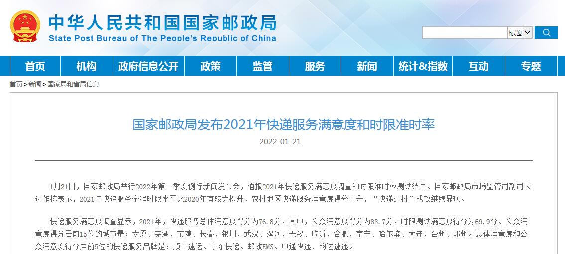 中国网1月21日讯 据国家邮政局网站消息,国家邮政局今日举行2022年第一季度例行新闻发布会,通报2021年快递服务满意度调查和时限准时率测试结果。国家邮政局市场监管司副司长边作栋表示,2021年快递服务全程时限水平比2020年有较大提升,农村地区快递服务满意度得分上升,“快递进村”成效继续显现。