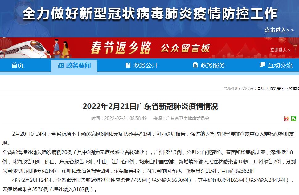 中国网2月21日讯 据广东省卫生健康委员会网站消息,2月20日0-24时,广东省新增新冠肺炎本土确诊病例6例和无症状感染者1例,均为深圳报告,通过纳入管控的密接排查或重点人群核酸检测发现。