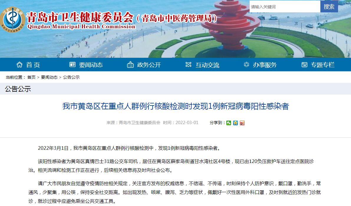 中国网3月1日讯 据山东省青岛市卫生健康委员会网站消息,2022年3月1日,青岛市黄岛区在重点人群例行核酸检测中,发现1例新冠病毒阳性感染者。
