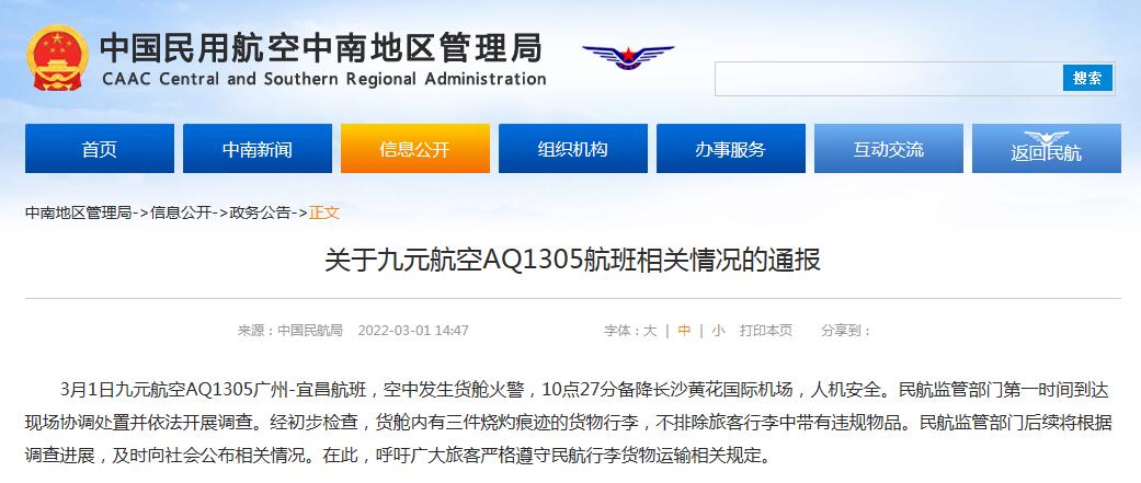 中国网3月1日讯 据中国民用航空中南地区管理局网站消息,中国民用航空中南地区管理局发布关于九元航空AQ1305航班相关情况的通报称,3月1日九元航空AQ1305广州-宜昌航班,空中发生货舱火警,10点27分备降长沙黄花国际机场,人机安全。