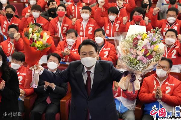 资料图:当地时间2022年3月10日,韩国首尔,韩国国民力量党候选人尹锡悦赢得第20届总统大选,当选下届韩国总统。澎湃影像