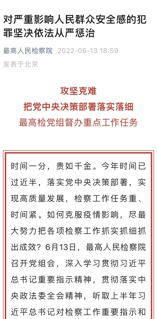 中国网6月13日讯 据最高人民检察院官方微信公众号消息,6月13日,最高人民检察院召开党组会,深入学习贯彻习近平总书记重要指示精神,贯彻落实中央政法委全会精神,听取上半年习近平总书记对检察工作重要指示和《中共中央关于加强新时代检察机关法律监督工作的意见》落实情况,结合重点工作任务“把脉问诊”,研究讨论做好检察环节服务保障经济社会高质量发展、维护社会和谐稳定的举措。最高检党组书记、检察长张军主持会议并提出工作要求。