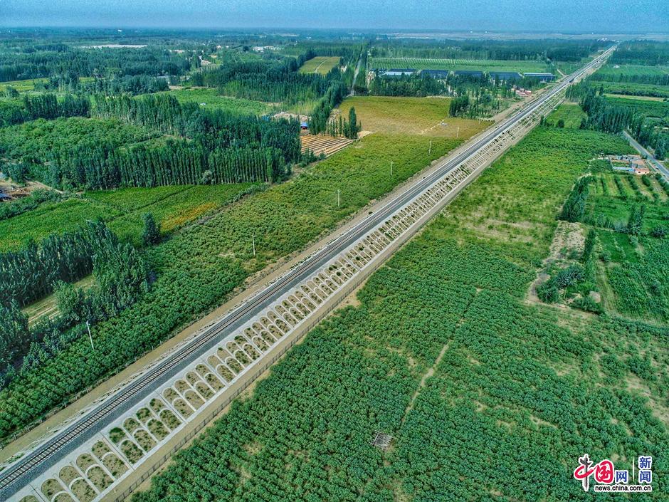 和若铁路地处世界第二大流动性沙漠——塔克拉玛干沙漠南缘,有534公里分布在风沙区域,占线路总长65%,是一条典型的沙漠铁路。自2018年12月开工建设以来,国铁集团组织参建单位根据沙漠地质特点,采取有力有效措施攻坚克难,确保了工程如期建成。针对沿线施工及混凝土养护严重缺水的实际,对434座桥墩采用墩身预制拼装技术,提前在工厂完成预制构件加工,再到现场进行拼装,有效克服缺水对建设进度的影响;针对部分区段风沙大、沙丘动态迁移容易掩埋线路的问题,采取以桥代路方式,建成总长达49.7公里的过沙桥5座,让风沙从桥下穿过,大幅降低风沙对线路的侵害威胁;按照“沙漠修铁路,治沙要先行”的建设理念,同步推进风沙防护工程建设,共修建草方格5000万平方米,种植梭梭、红柳、沙棘等灌木和乔木1300万株,形成防沙护路的绿色屏障。
