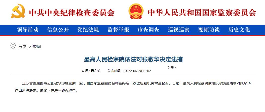 中国网6月20日讯 据中央纪委国家监委网站消息,江苏省委原副书记张敬华涉嫌受贿一案,由国家监察委员会调查终结,移送检察机关审查起诉。日前,最高人民检察院依法以涉嫌受贿罪对张敬华作出逮捕决定。该案正在进一步办理中。