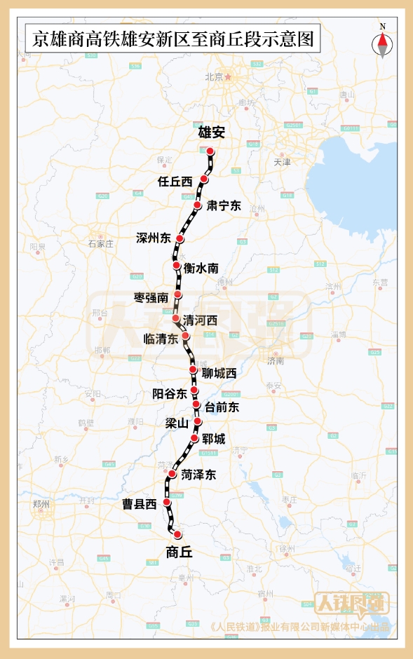 此次开工建设的京雄商高铁雄安新区至商丘段,设计时速350公里、正线全长552公里,建设工期4年。线路北起京雄城际铁路雄安站,经河北省雄安新区、沧州市、衡水市、邢台市,山东省聊城市,河南省濮阳市,山东省济宁市、菏泽市至河南省商丘市,终至商合杭高铁商丘站。全线设雄安、任丘西、肃宁东、深州东、衡水南、枣强南、清河西、临清东、聊城西、阳谷东、台前东、梁山、郓城、菏泽东、曹县西、商丘16座车站,其中雄安和菏泽东2座车站为既有车站,梁山、郓城、商丘3座车站为改扩建车站,衡水南等11座车站为新建车站。京雄商高铁雄安新区至商丘段全线桥梁占比约94%,其中位于河南省濮阳市台前县的黄河特大桥是全线控制性工程。
