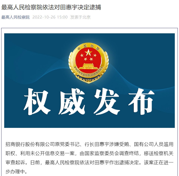 中国网10月26日讯 据最高人民检察院官方微信公众号消息,招商银行股份有限公司原党委书记、行长田惠宇涉嫌受贿、国有公司人员滥用职权、利用未公开信息交易一案,由国家监察委员会调查终结,移送检察机关审查起诉。日前,最高人民检察院依法对田惠宇作出逮捕决定。该案正在进一步办理中。