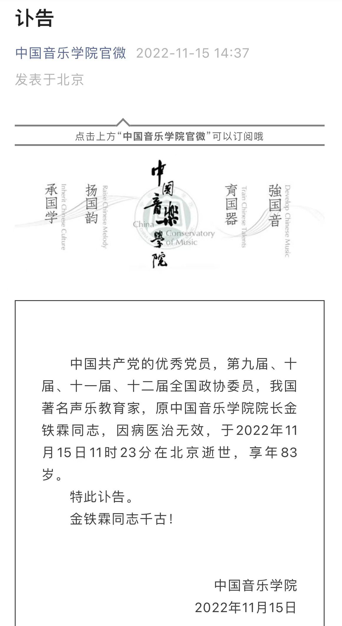 中国网11月15日讯 中国音乐学院官微今日发布讣告,中国共产党的优秀党员,第九届、十届、十一届、十二届全国政协委员,中国著名声乐教育家,原中国音乐学院院长金铁霖同志,因病医治无效,于2022年11月15日11时23分在北京逝世,享年83岁。