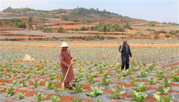 温泉村委会小沙湾村村民季坤彦开着拉水车缓缓来到田边,接管、放水,不一会,拥有20立方米存储量的水池便装满了。季坤彦说:“我今天拉了四趟,这些水主要是放在蓄水池里用于滴灌。今年天气比较干旱,滴灌用下来效果比较好,省工还省水,烟苗长势也不错。”