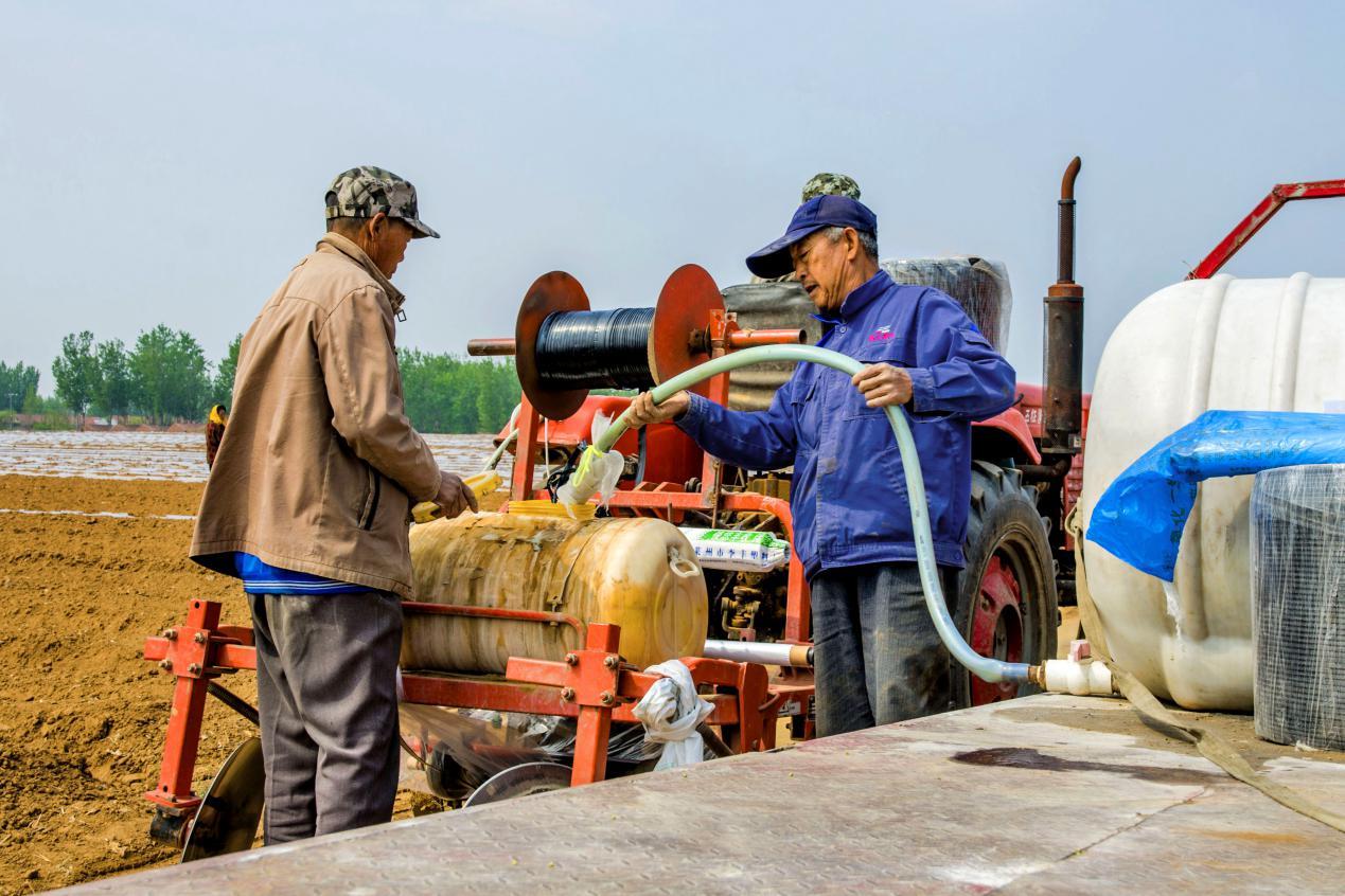 图为:成立供水服务队为用水不便地块送水到地头
