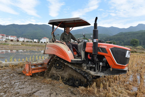 风和日丽、春光明媚。在福建省上杭县庐丰畲族乡农田里,身穿“黄马甲”的机耕手蓝小强熟练操作培土机进行培土作业,成为绿色农田里一道亮丽的风景。