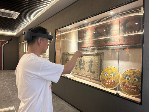 同时,在另一边的村史馆中也隐藏着一个“科技先锋”——AR眼镜,我们看到村民正戴着眼镜,在工作人员的引导下,沉浸在AR体验中玩得不亦乐乎。据了解,体验者佩戴 AR 头显后,通过识别相关展品,即可在真实的空间内出现虚拟动态三维立体画面,并可通过手部识别等功能,与展品进行交互体验,在增加趣味性的同时,进一步促进民俗文化的传承。