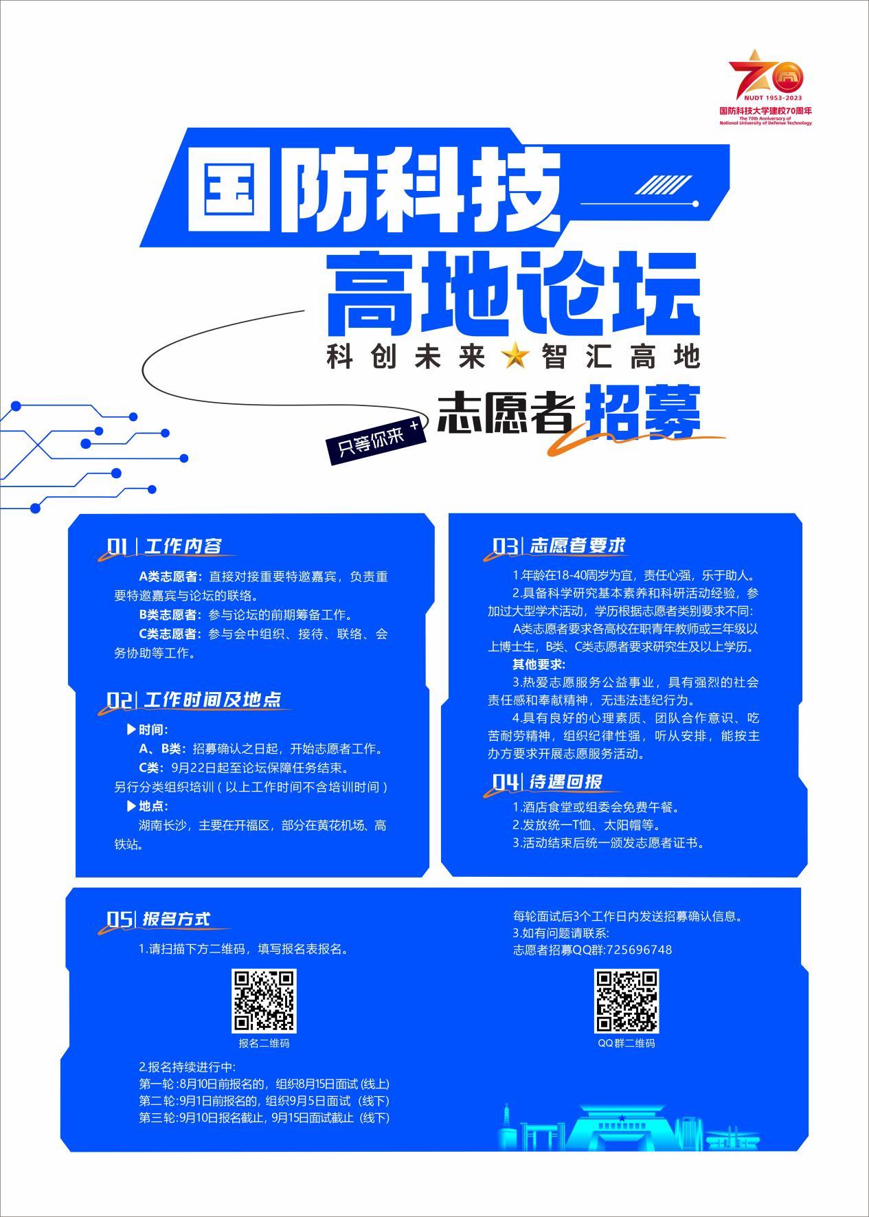 国防科技大学牵头举办的首届国防科技高地论坛将于9月25日在长沙开幕。日前,论坛组织委员会办公室发布公告,面向社会广泛征集海选志愿者和Logo作品。