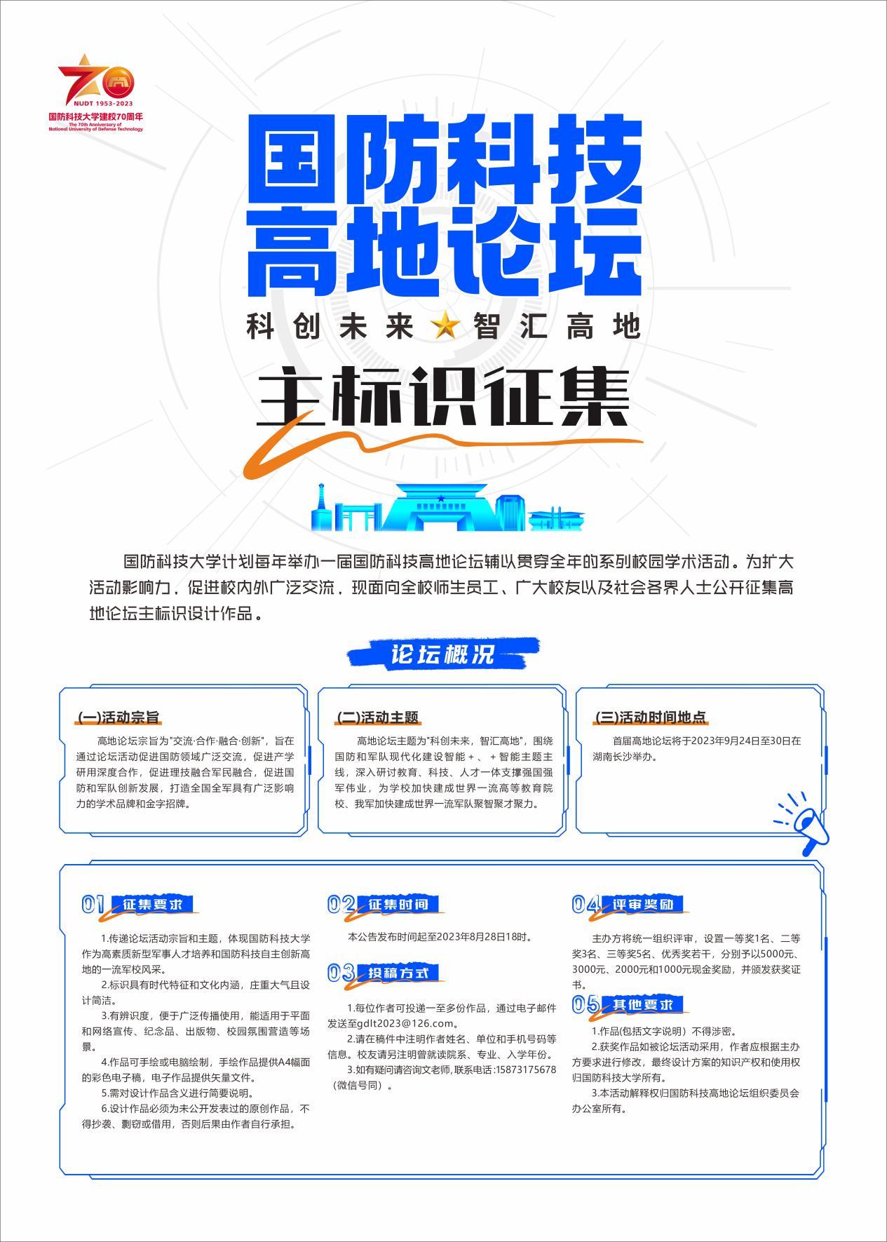 国防科技大学计划围绕国防科技高地论坛,每年策划举办一系列学术活动。为扩大活动影响力,促进校内外广泛交流,论坛面向社会公开征集主标识设计作品。应征作品要求体现活动宗旨和主题,体现国防科技大学一流军校风采,具有时代特征、文化内涵和科大特色,适用于平面和网络宣传、纪念品、出版物、校园氛围营造等场景。主办方将根据专家评审意见,评选若干优秀作品予以表彰和奖励。投稿详情可扫描下方二维码和点击海报了解,截止日期为8月31日。