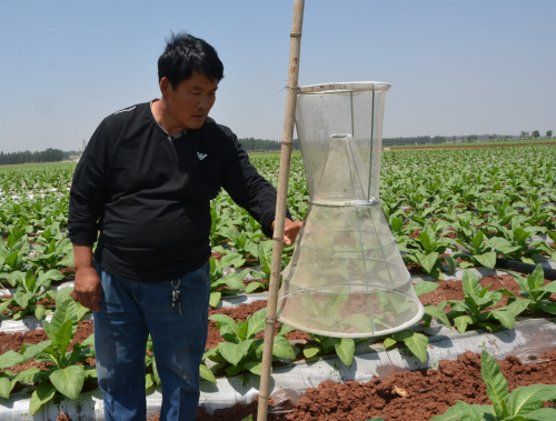 图为:徐西辉查看田间诱捕器的捕虫情况