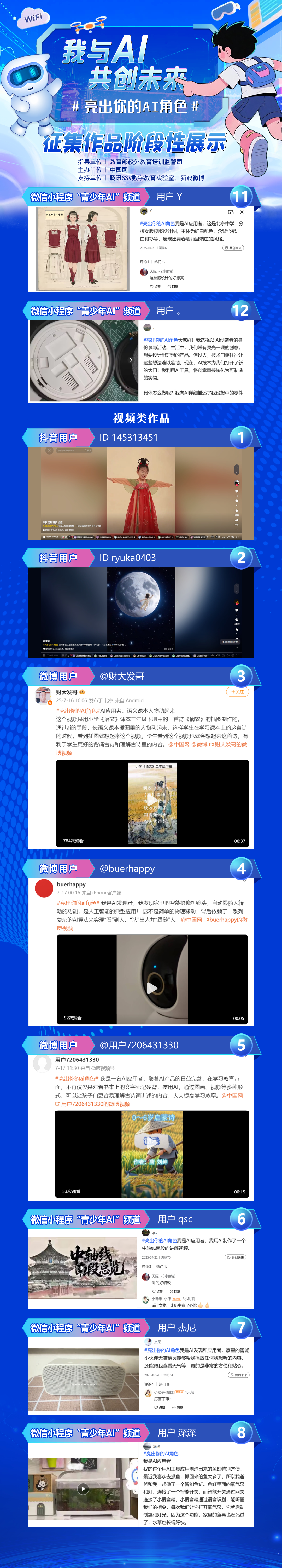 为更好地突出人工智能的应用导向,提升青少年人工智能素养,搭建一个全民参与的AI创新平台,2025年7月15日,由教育部校外教育培训监管司指导,中国网主办,腾讯SSV数字教育实验室、新浪微博支持的大型互动征集活动#亮出你的AI角色#大型正式启动!此次征集活动,通过“AI发现者、AI畅想者、AI应用者、AI创造者”四个角色,号召全国中小学生及社会各界积极参与到“AI的创意之旅”,通过记录、想象、应用或创造,来展现人工智能技术在各领域的创新实践。
