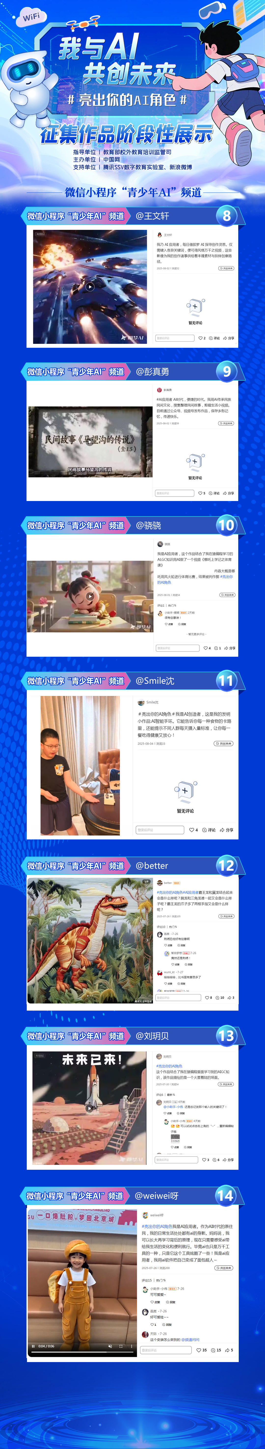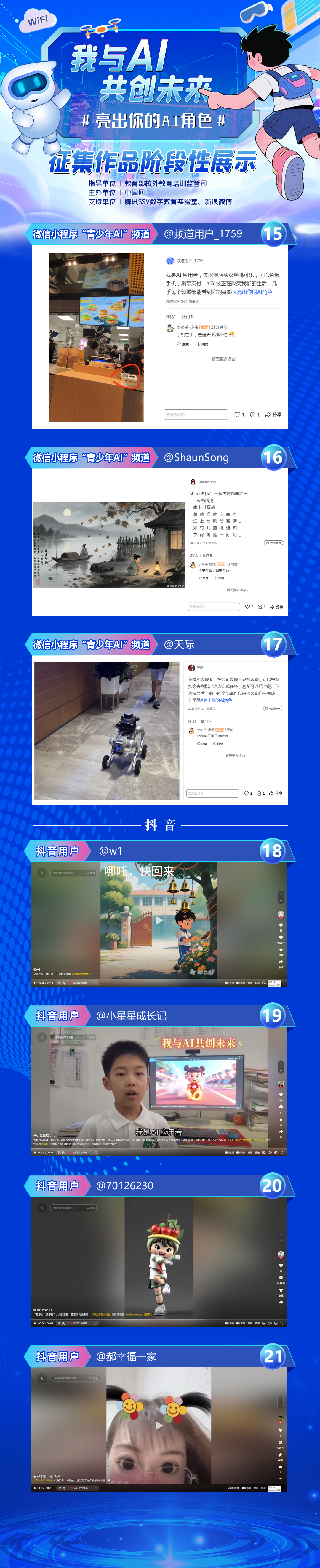 为更好地突出人工智能的应用导向,提升青少年人工智能素养,搭建一个全民参与的AI创新平台,2025年7月15日,由教育部校外教育培训监管司指导,中国网主办,腾讯SSV数字教育实验室、新浪微博支持的大型互动征集活动#亮出你的AI角色#大型正式启动!此次征集活动,通过“AI发现者、AI畅想者、AI应用者、AI创造者”四个角色,号召全国中小学生及社会各界积极参与到“AI的创意之旅”,通过记录、想象、应用或创造,来展现人工智能技术在各领域的创新实践。