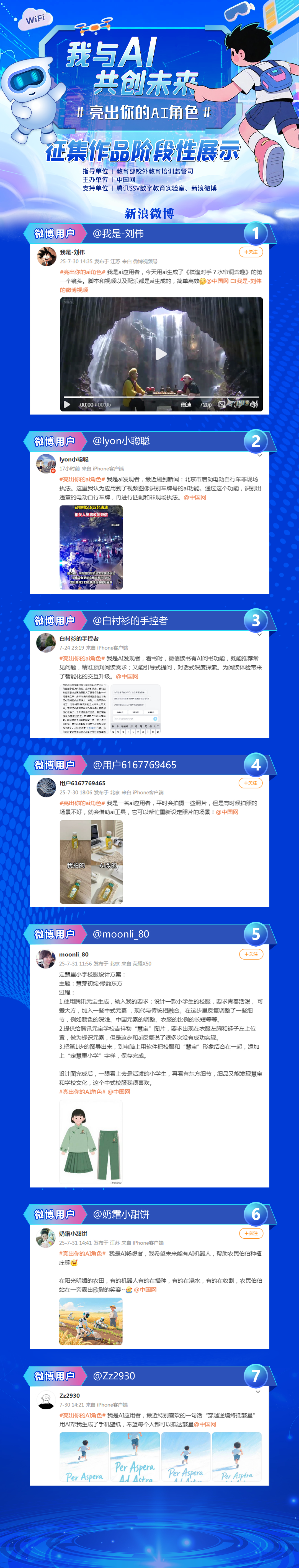 活动一经上线,就获得广大网友的热情关注和广泛参与,并于7月15至16日,登上新浪微博热搜排名第三。截至当前,新浪微博#亮出你的AI角色#话题阅读量达4596.8万,各类社交媒体平台话题讨论量过万。即日起,#亮出你的AI角色#将精选投稿作品,陆续展示,用创意与智慧一起“我与AI共创未来”!