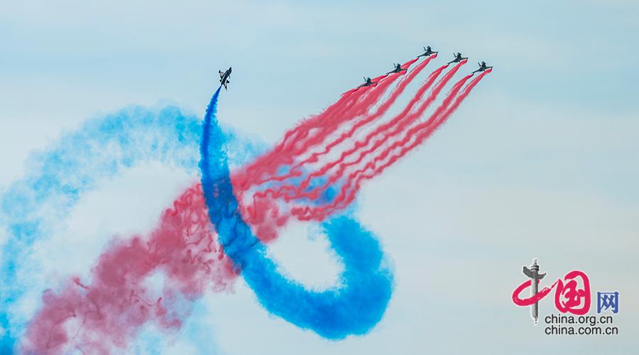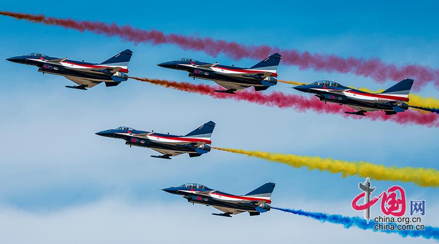 2025年9月19日,2025空军航空开放活动和长春航空展在长春国际航空博览城拉开帷幕。图为空军八一表演队飞行表演。中国网记者 王月博 摄