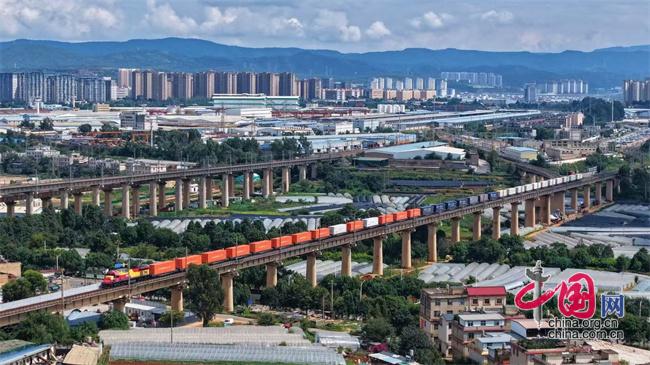 一列满载货物的中老铁路“澜湄快线”国际货物列车正从昆明出发沿中老铁路驶向万象。中国网发 杨紫轩 摄