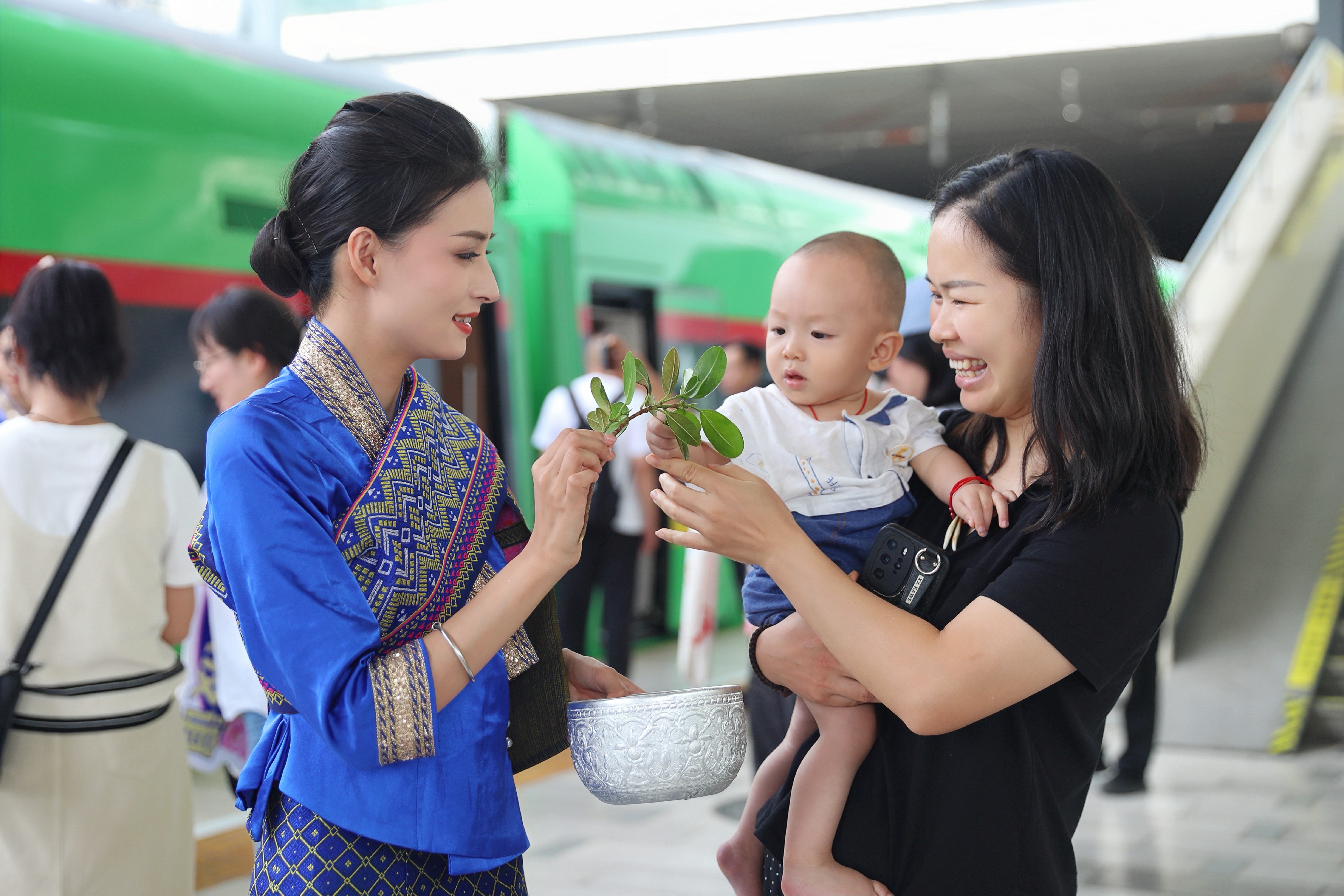身穿民族服饰的中老铁路“金花”列车员和旅客互动。中国网发 杨紫轩 摄